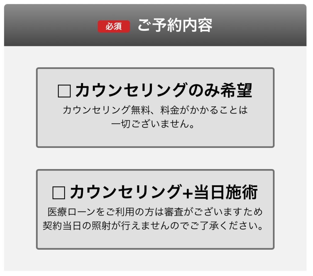 ゴリラクリニックの初回カウンセリングは、「カウンセリングのみ希望」または「カウンセリング+当日施術」のどちらかを選択できます。